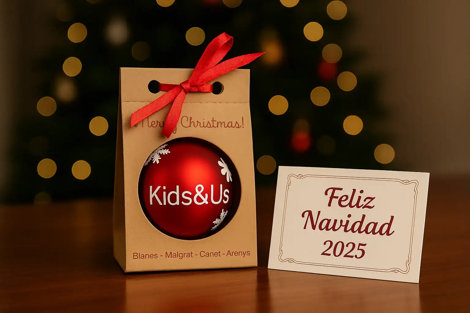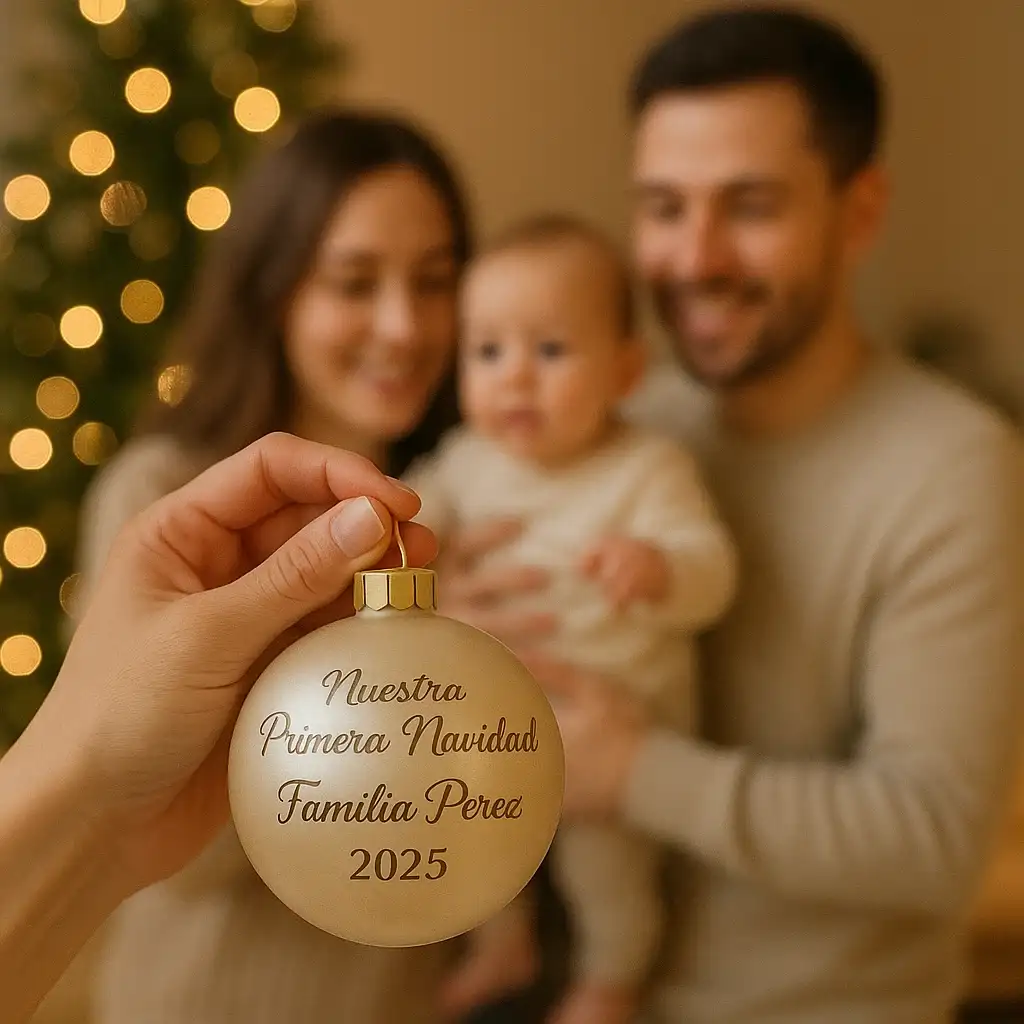 Mantén el mensaje original en rojo (“Javier y Rosa”, por ejemplo) y deja el protagonismo al nombre sobre la bola.Mesa de firmas navideña